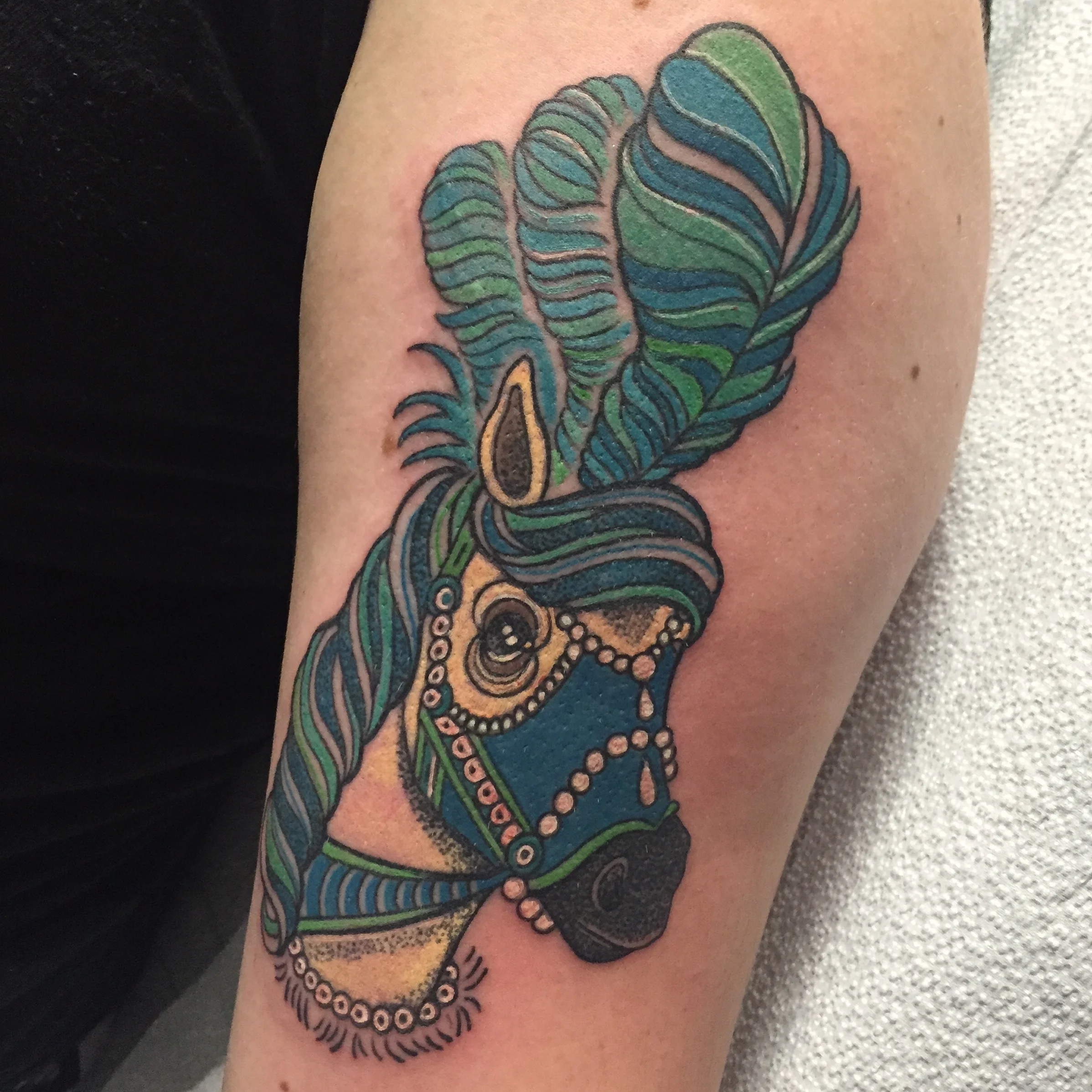 Colorful tattoo of a horse's head wearing a headdress with feathers and beads. View fullsize