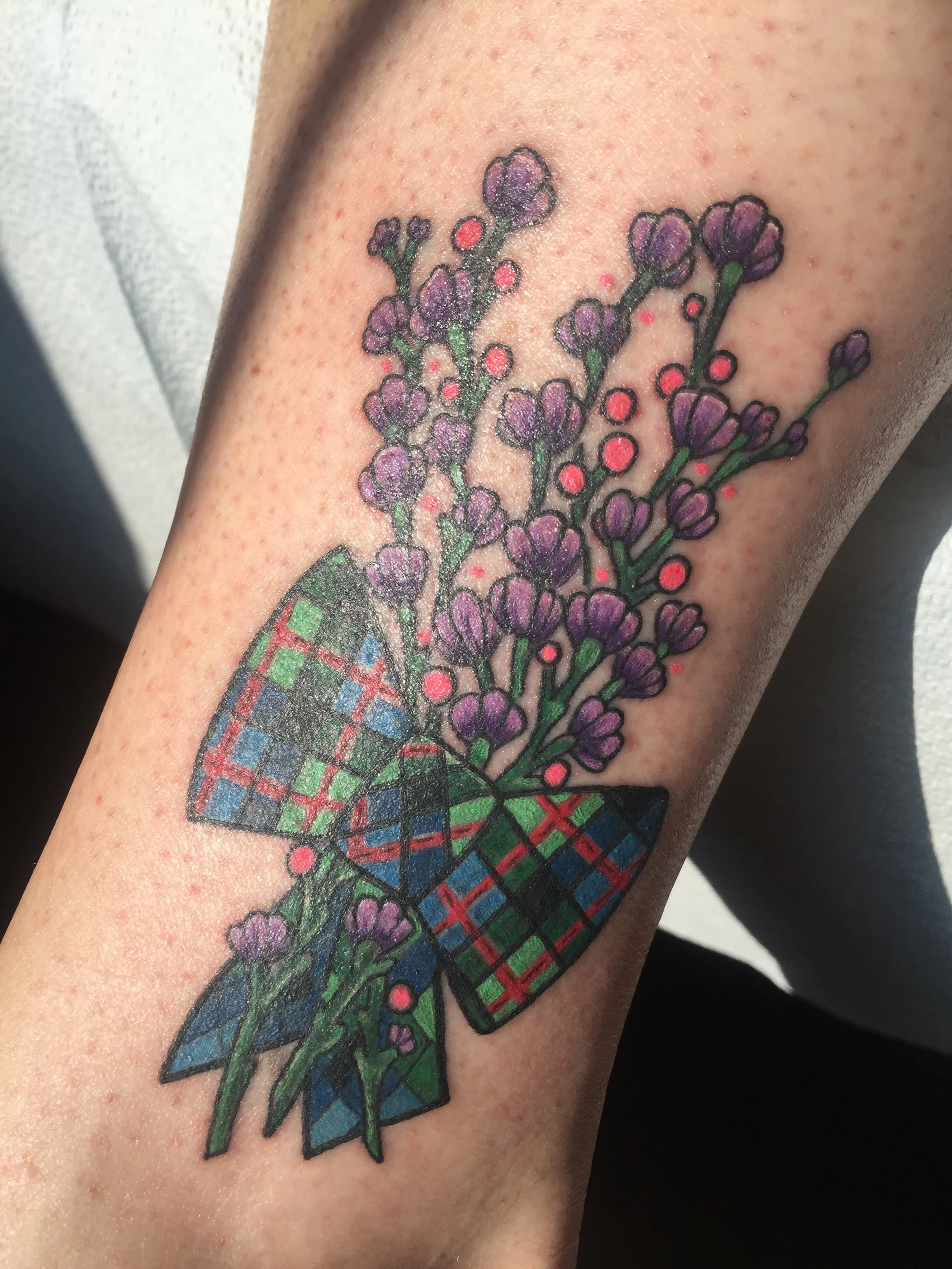 Tattoo of purple flowers with a colorful plaid butterfly on someone’s arm. View fullsize