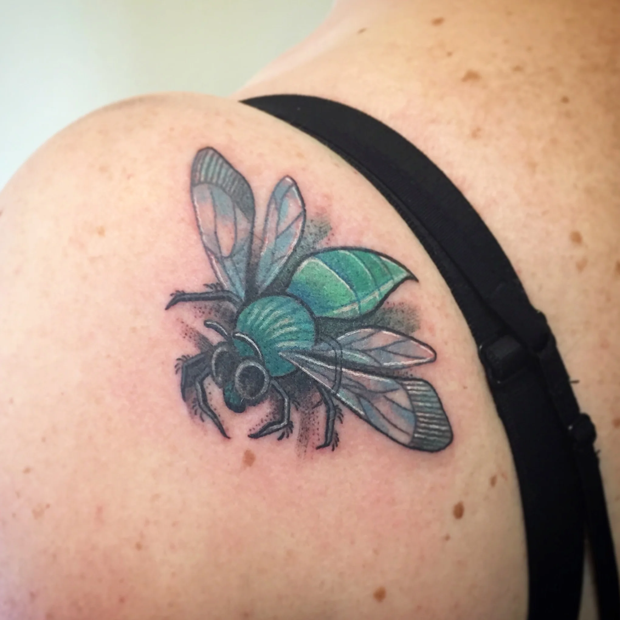 Tattoo of a blue Monarch butterfly on a person's side abdomen.