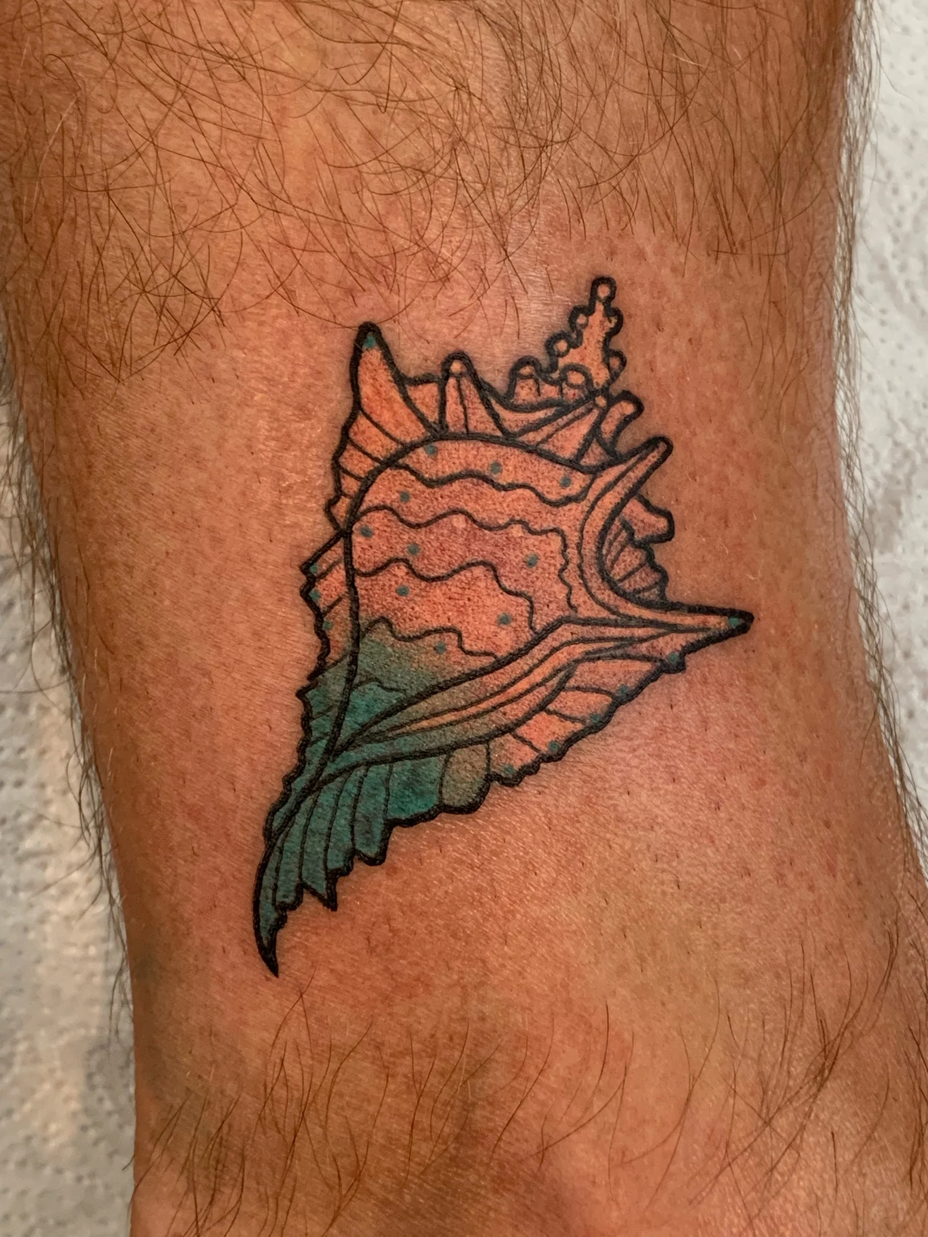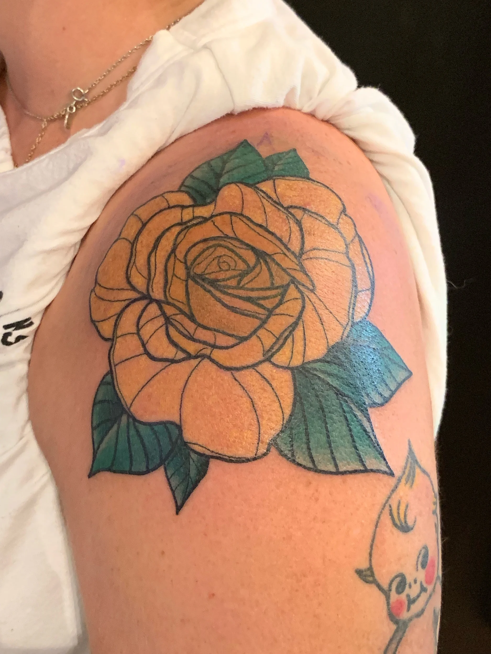 Tattoo of a yellow banana peel with some black speckles on the person's arm. View fullsize
