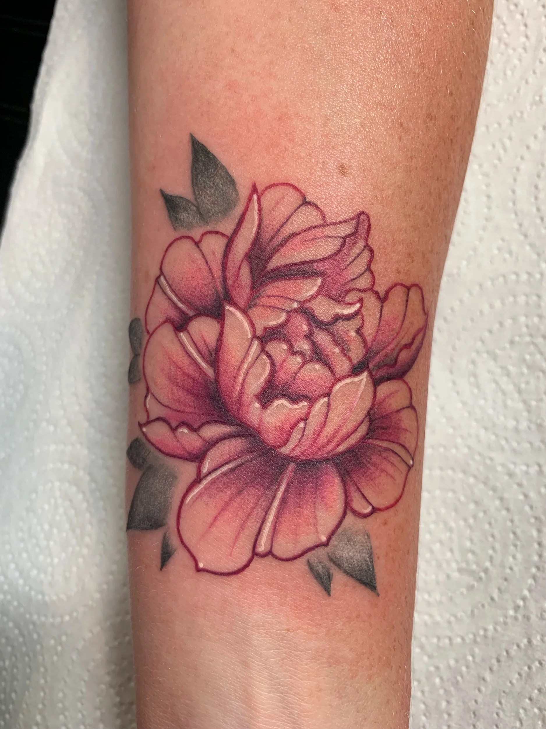 Colorful floral tattoo featuring pink, purple, blue, and beige flowers on an arm.