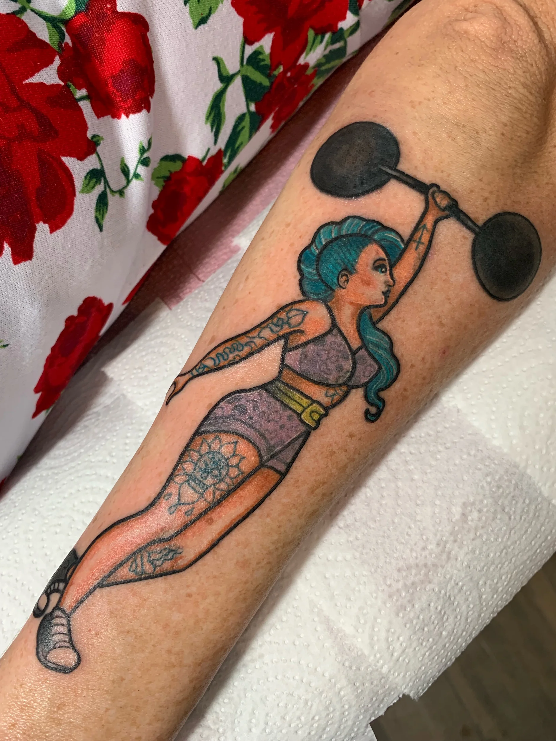 Tattoo of a woman in a red dress and red high heels sitting inside a martini glass, holding a cocktail shaker, with musical notes and sparkling effects above.
