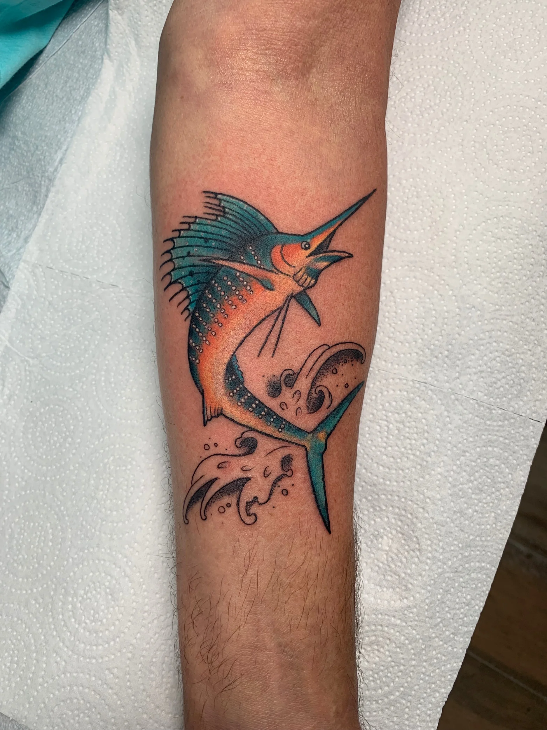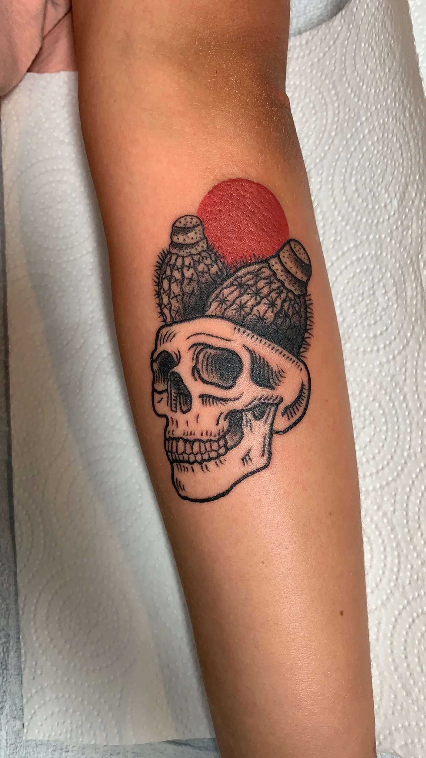 A colorful tattoo of a dagger with a red flower, green leaves, and a skull on a person's forearm.
