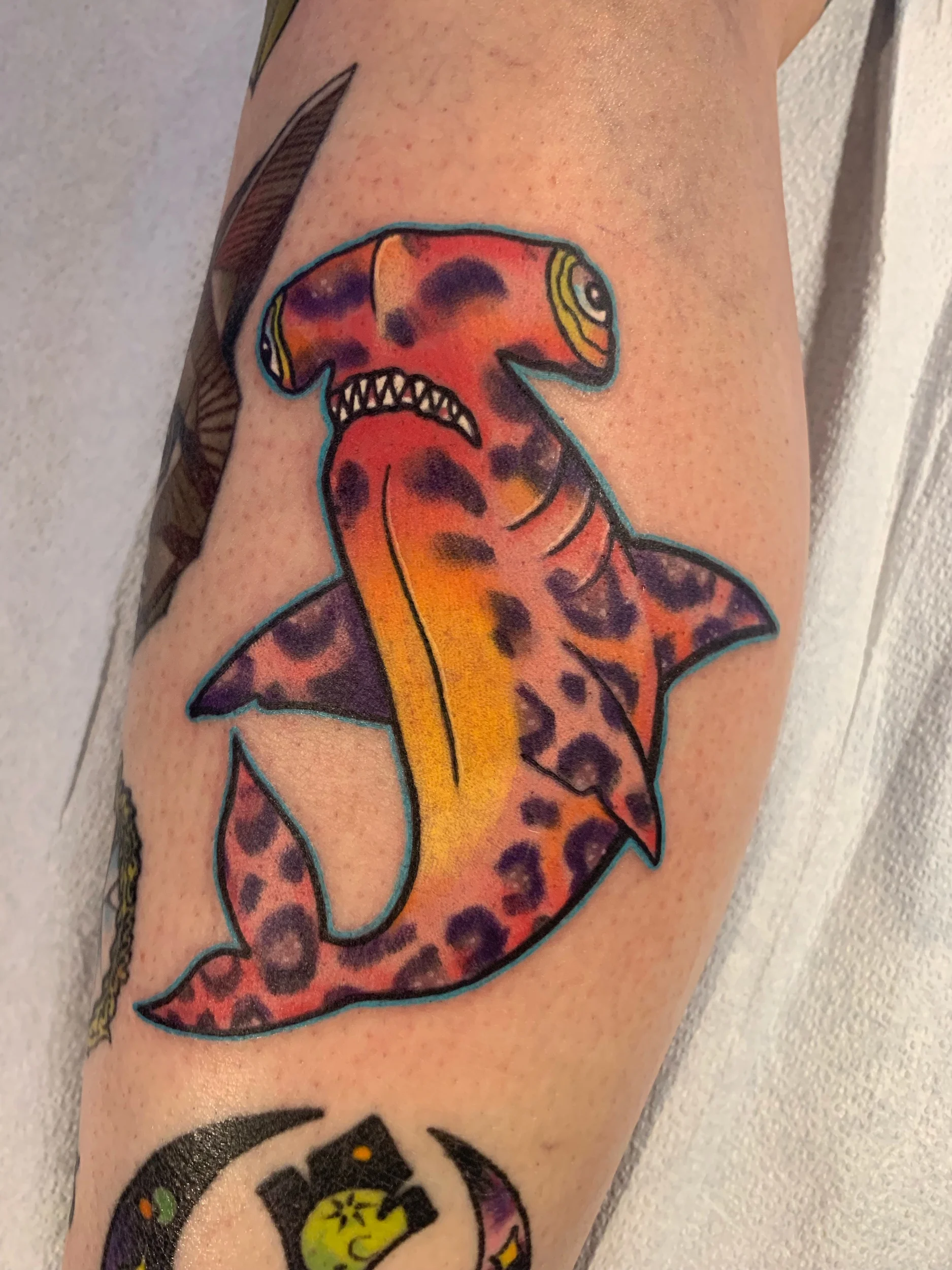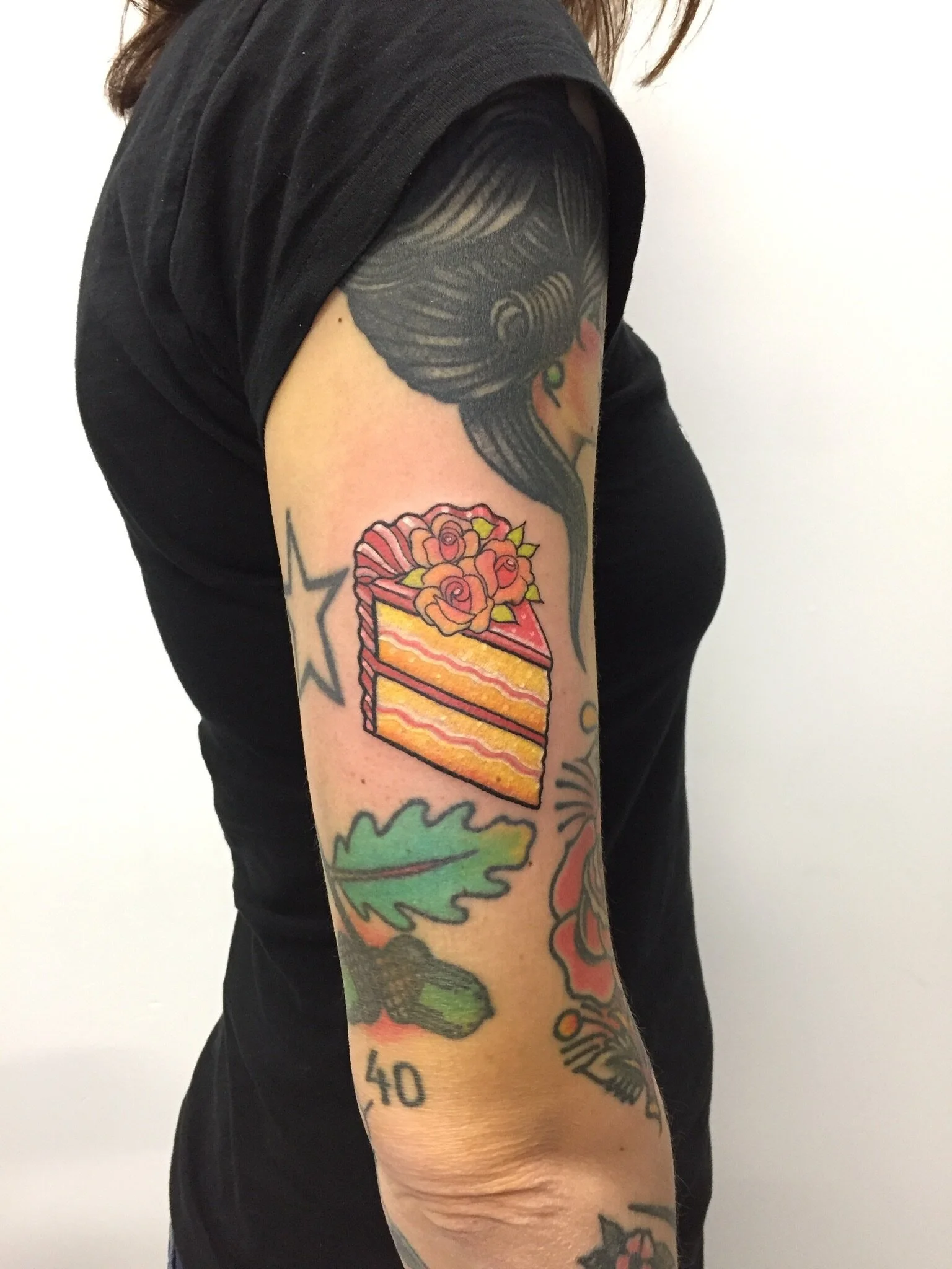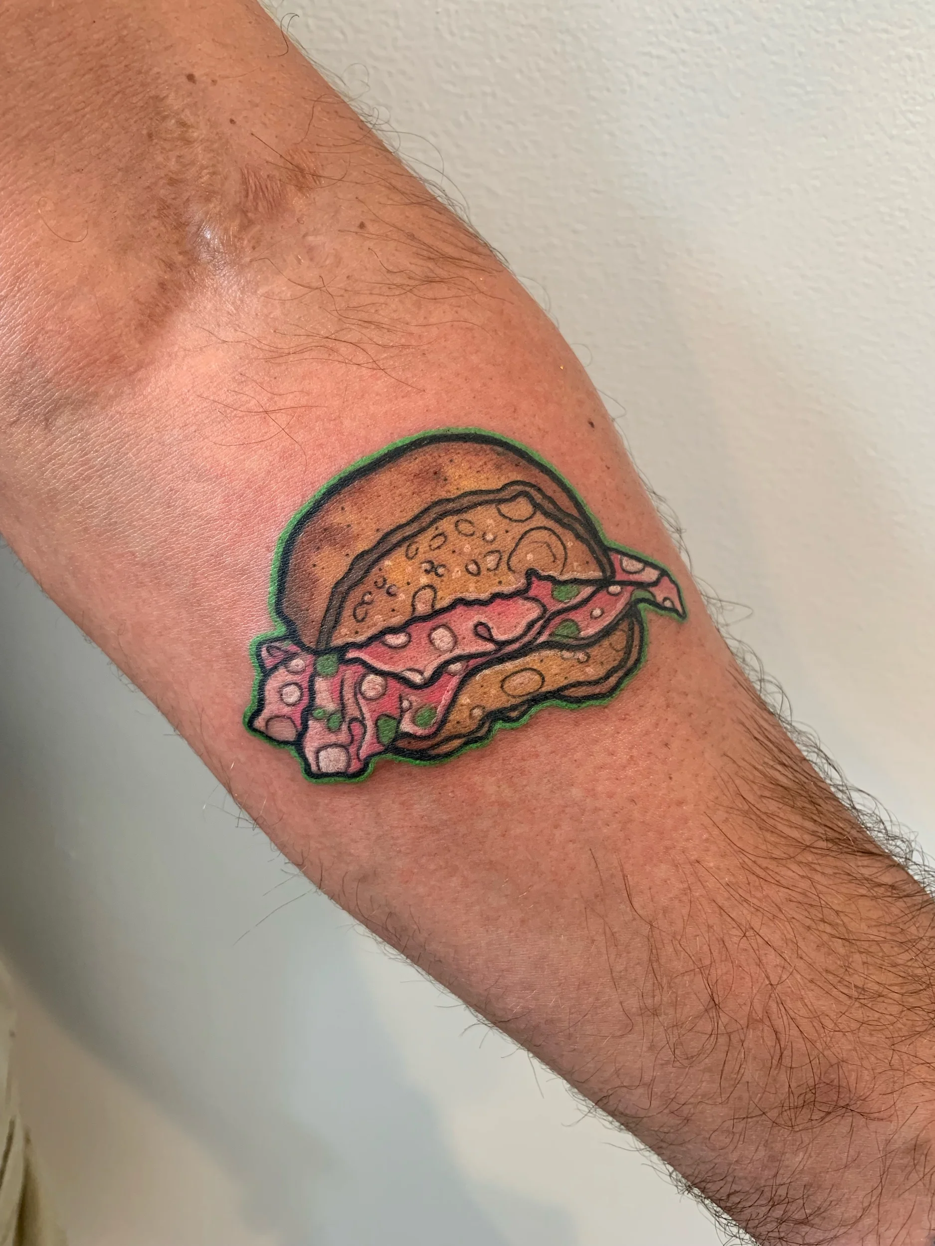 A tattoo of a taco with rainbow-colored shredded lettuce and cheese, and a seasoned beef filling. View fullsize
