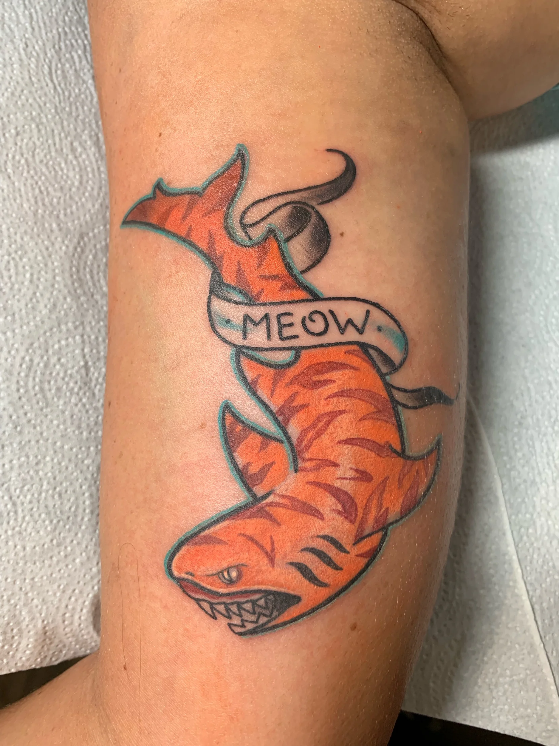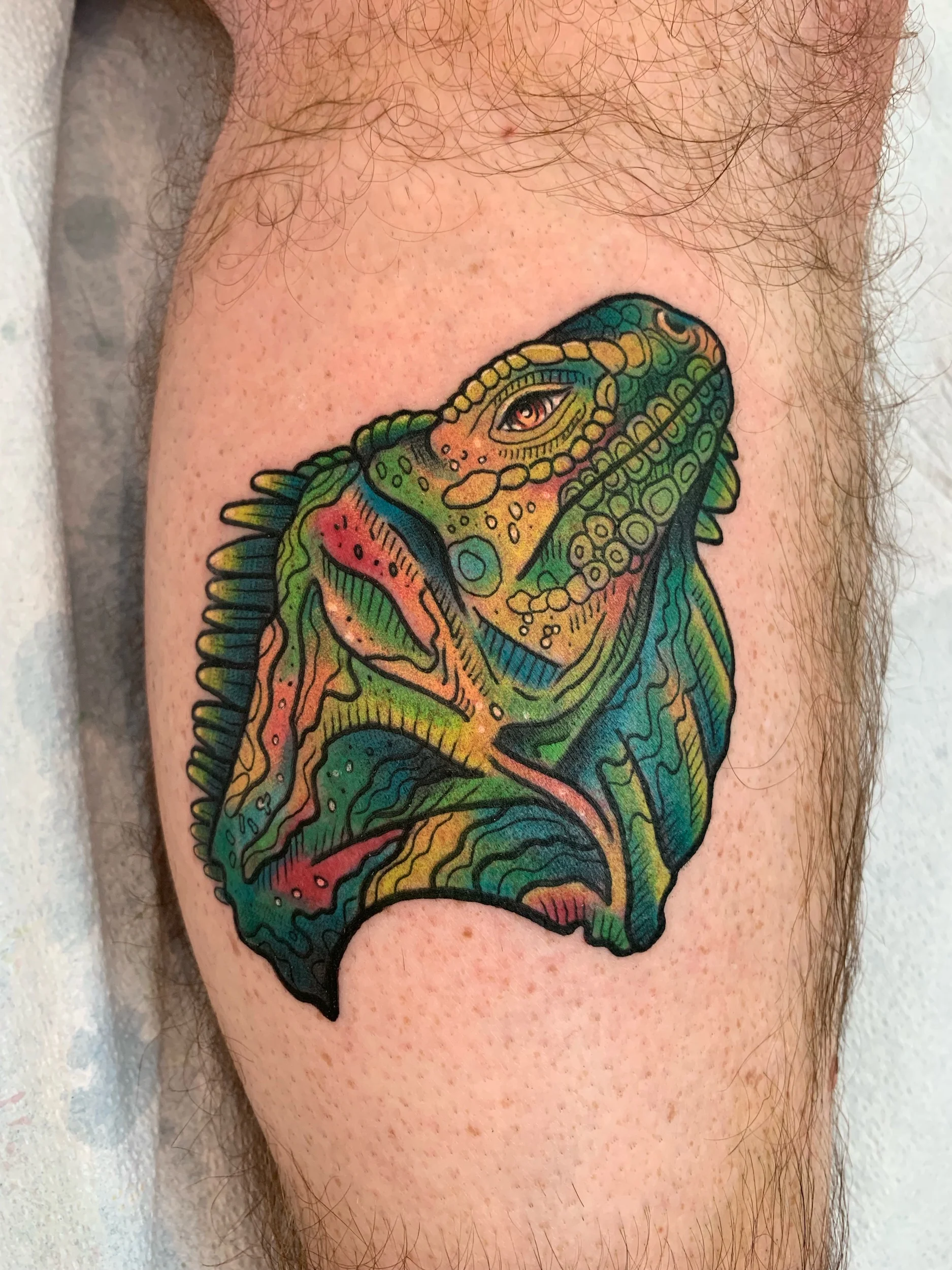 Tattoo of a fierce tiger's face with green eyes, open mouth showing teeth and tongue, detailed in black, orange, yellow, and red ink.