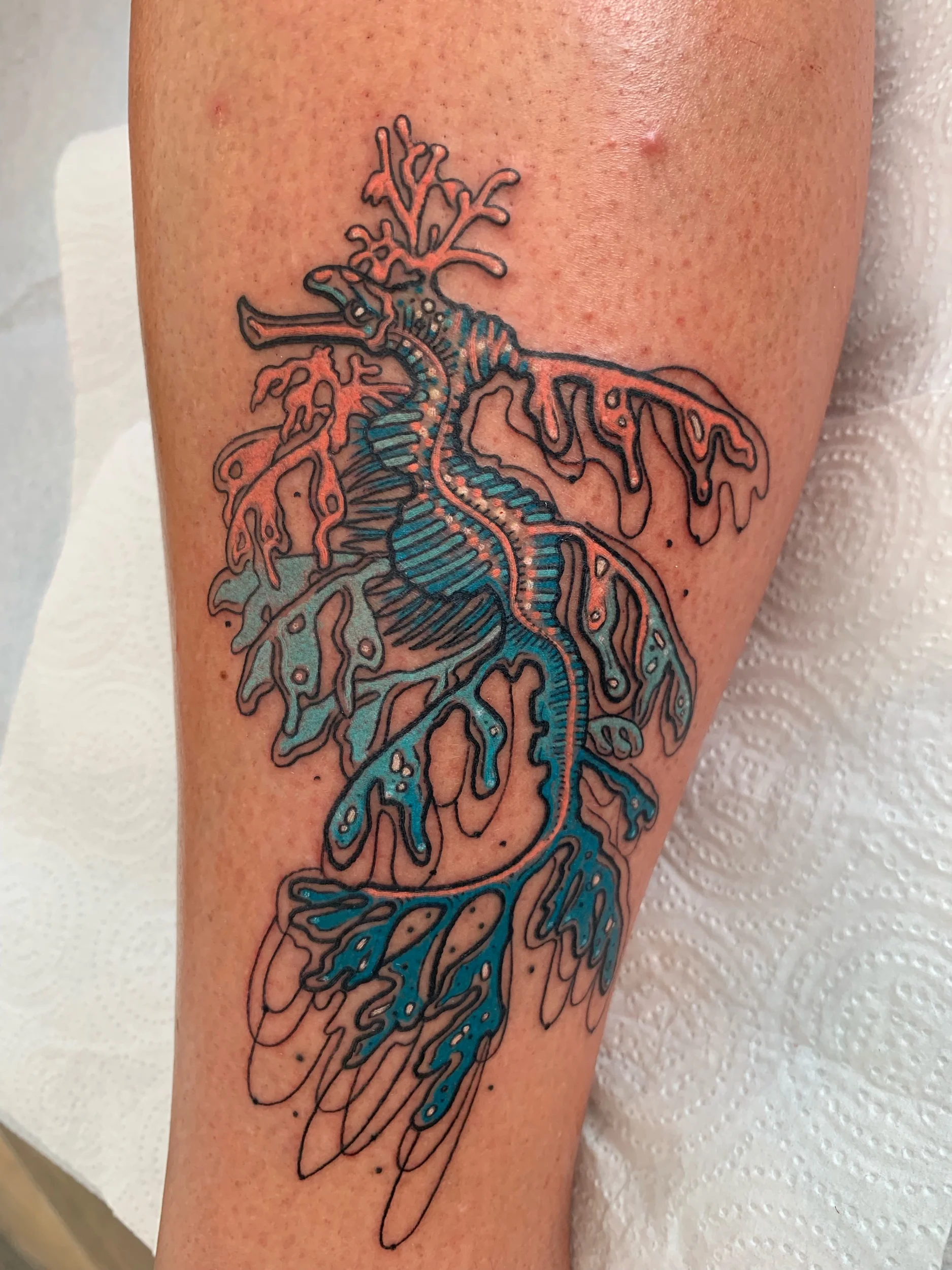 Colorful tattoo of a horse's head wearing a headdress with feathers and beads.