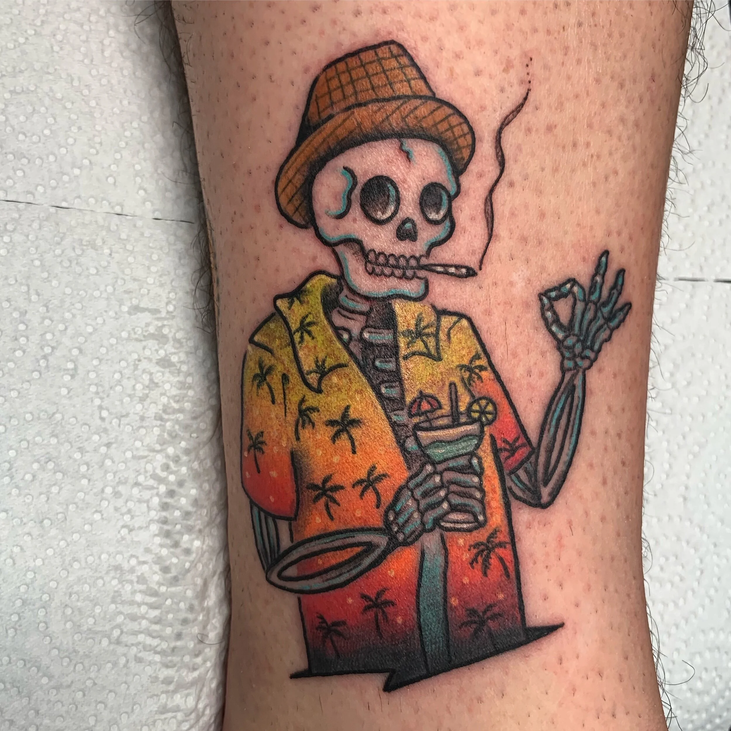 A tattoo of a cartoon pickles character dressed as a cowboy with a pink hat, red boots, and a belt, holding a gun in one hand and a pipe in the other.