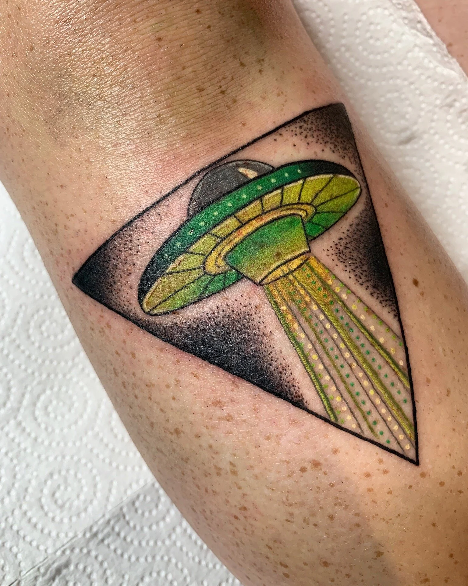 Tattoo of a green, one-eyed alien creature with a large eye, a horn on its head, and multiple arms, wearing a belt and inside a UFO-shaped frame.